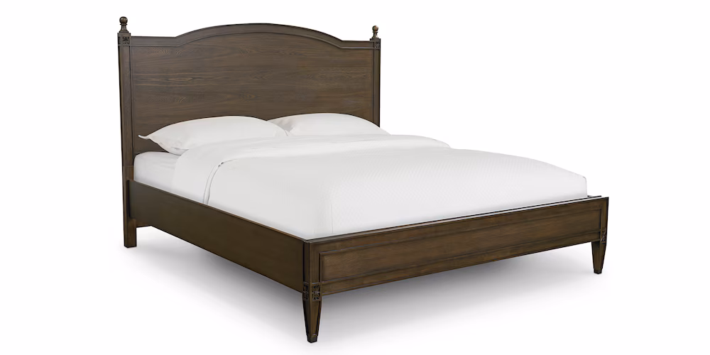 Like the frame of a classic painting, the Charlotte Panel Bed adds old-world charm to the room with its pared-down traditional lines. The shape of the arched wood panel headboard pairs with the simplicity of a low wood footboard. Traditional details include the understated carved rosettes and recessed lines in the bed’s gently tapered legs, metal ferrules, and bedposts with simply turned finials. Modern finishes highlight the details and grain of the elm veneer with moderate distressing and glaze. Choose dark Tavern finish or soft Washed Elm Dimensions: Height 58″ Width 80″ Depth 87″